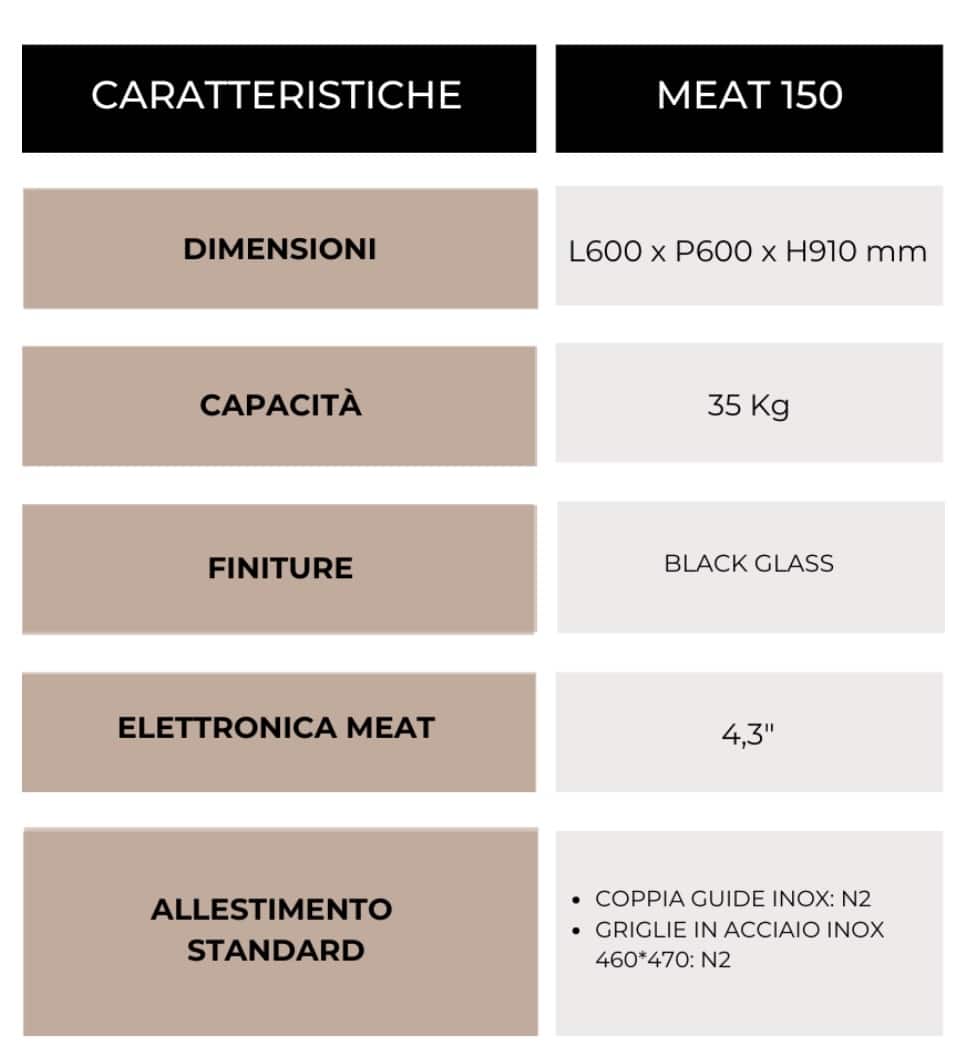 Perfetto per chi è agli inizi e necessita di carichi più piccoli, MEAT 150 è il gioiello compatto ideale per spazi ridotti come piccole botteghe e macellerie. Con il suo design accattivante, questo modello si colloca perfettamente sopra il bancone, offrendo una vista affascinante che attirerà l’attenzione della clientela.